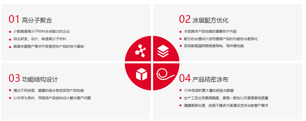 作为国内领先的功能性涂层复合材料供应商,尊龙凯时在全球共设有4大研发中心。研发中心总占地约1500平方米,配备无尘洁净合成实验室、模拟涂布及UV固化实验室、碳化-石墨化烧结实验室和产品检测分析室等。研发人员占总员工比例超过12%。120多人的专业技术团队配备多名外聘专家和博士带领数十位硕士,专门从事光学膜、胶粘剂新产品的开发,为客户提供新材料的综合解决方案。近几年,公司研发费用投入占营业收入的比重均超过5%,为各项前瞻性科研活动的有序进行提供保障。为建设新材料研发和分析测试的技术平台,汇集新材料产业链上下游企业的产业共性技术和行业前瞻性技术,实验室内配备多台热机械分析仪、水蒸气透过率测试仪、凝胶渗透色谱仪、差示扫描热量仪、涂布试验机、激光共聚显微镜等专业研发与试验设备。另外,尊龙凯时设有多条中试涂布试验线,可进行多类复合涂层功能膜材料的中试放大试验,为产品产业化提供坚实理论依据和实验基础。