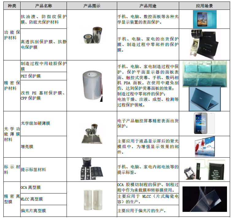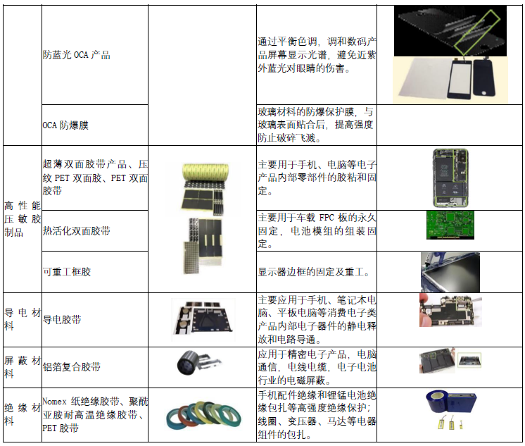 公司主要产品包括功能性薄膜材料、电子级胶粘材料、热管理复合材料和薄膜包装材料四大类。其中,功能性薄膜材料、电子级胶粘材料和热管理复合材料产品主要应用于消费电子产品内外部电子器件相关功能的实现,如智能手机、平板电脑、笔记本电脑、智能手环等使用的保护、固定、电磁屏蔽、电气绝缘、热量管理等功能性材料,以及智能手机等产品的触摸屏使用的防静电、防眩光、防指纹保护膜等材料。随着公司不断加强对新市场的投入,持续开发针对性产品,扩展产品应用领域,目前已有产品规模化应用于新能源汽车锂电池组件,以实现绝缘、阻燃、结构固定等功能。薄膜包装材料产品主要应用于商业包装领域,以满足食品、轻纺等行业的商业包装需求。
